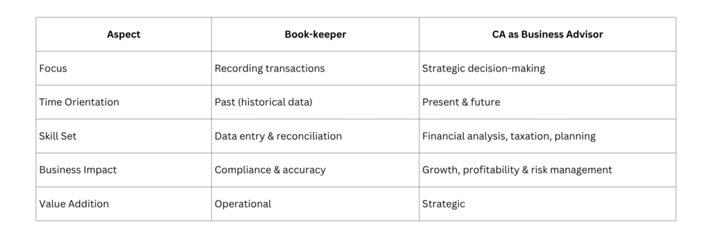 In today’s challenging and heavily controlled business landscape, simply having a bookkeeping service is not enough. Business owners who consider their CA as a valuable asset will be able to gain clarity, confidence, and control over their company’s finances.
